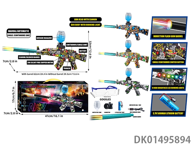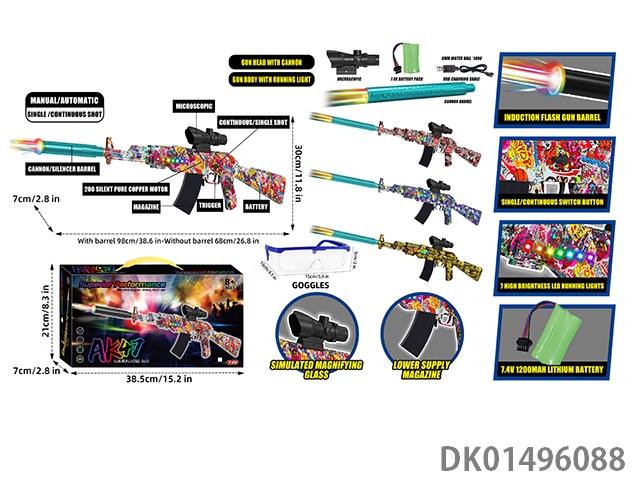 可拆装9合1双锂电池供电七彩灯光电动声音AK47突击步枪水球8毫米空气弹射上供弹3种模式射击游戏套装(枪头感应镭射灯炮和枪身环绕流星灯)