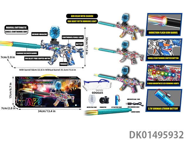 可拆装9合1双锂电池供电七彩灯光电动声音MP5冲锋枪水球8毫米空气弹射上供弹3种模式射击游戏套装(枪头感应镭射灯炮和枪身环绕流星灯)