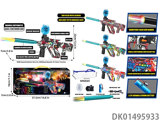 可拆装10合1双锂电池供电七彩灯光电动声音AUG突击步枪水球8毫米空气弹射上供弹3种模式射击游戏套装(枪头感应镭射灯炮和枪身环绕流星灯)