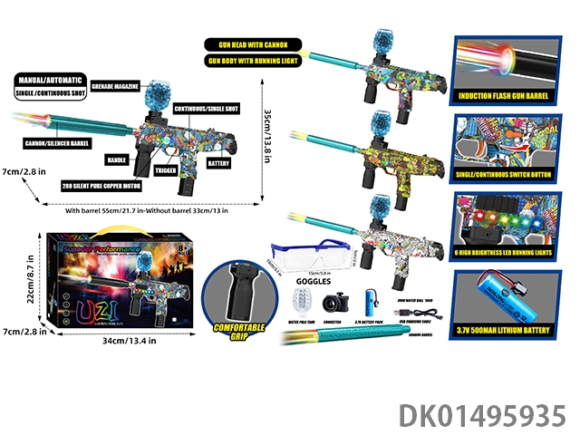 可拆装10合1双锂电池供电七彩灯光电动声音UZI冲锋枪水球8毫米空气弹射上供弹3种模式射击游戏套装(枪头感应镭射灯炮和枪身环绕流星灯)