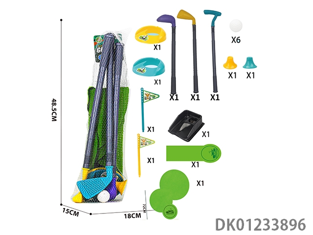 3 Golf clubs and 2 sets of hole flags, accompanied by a fiber non-woven fabric 64x72cm and a training track set (96cm long)