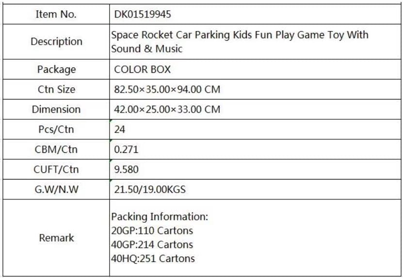 Packing Information: 20GP:110Cartons; 40GP:214Cartons; 40HQ:251Cartons